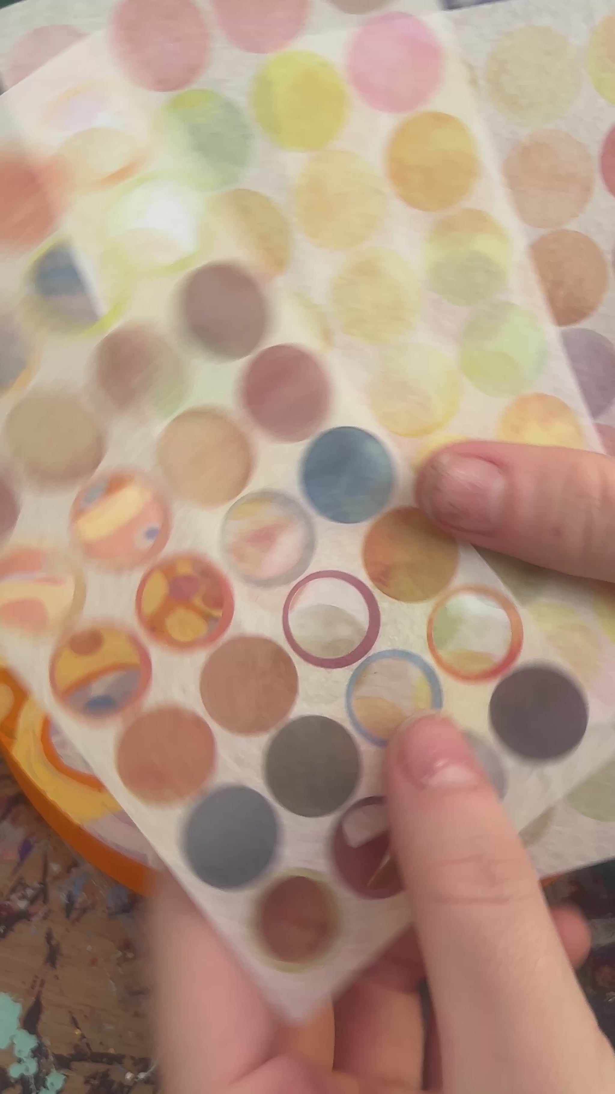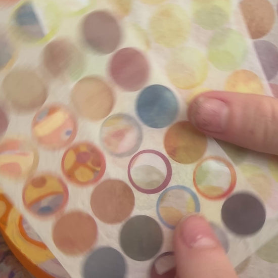 Layered oranges, yellows and pinks loop across the surface, accented by meticulously placed dots of colour.