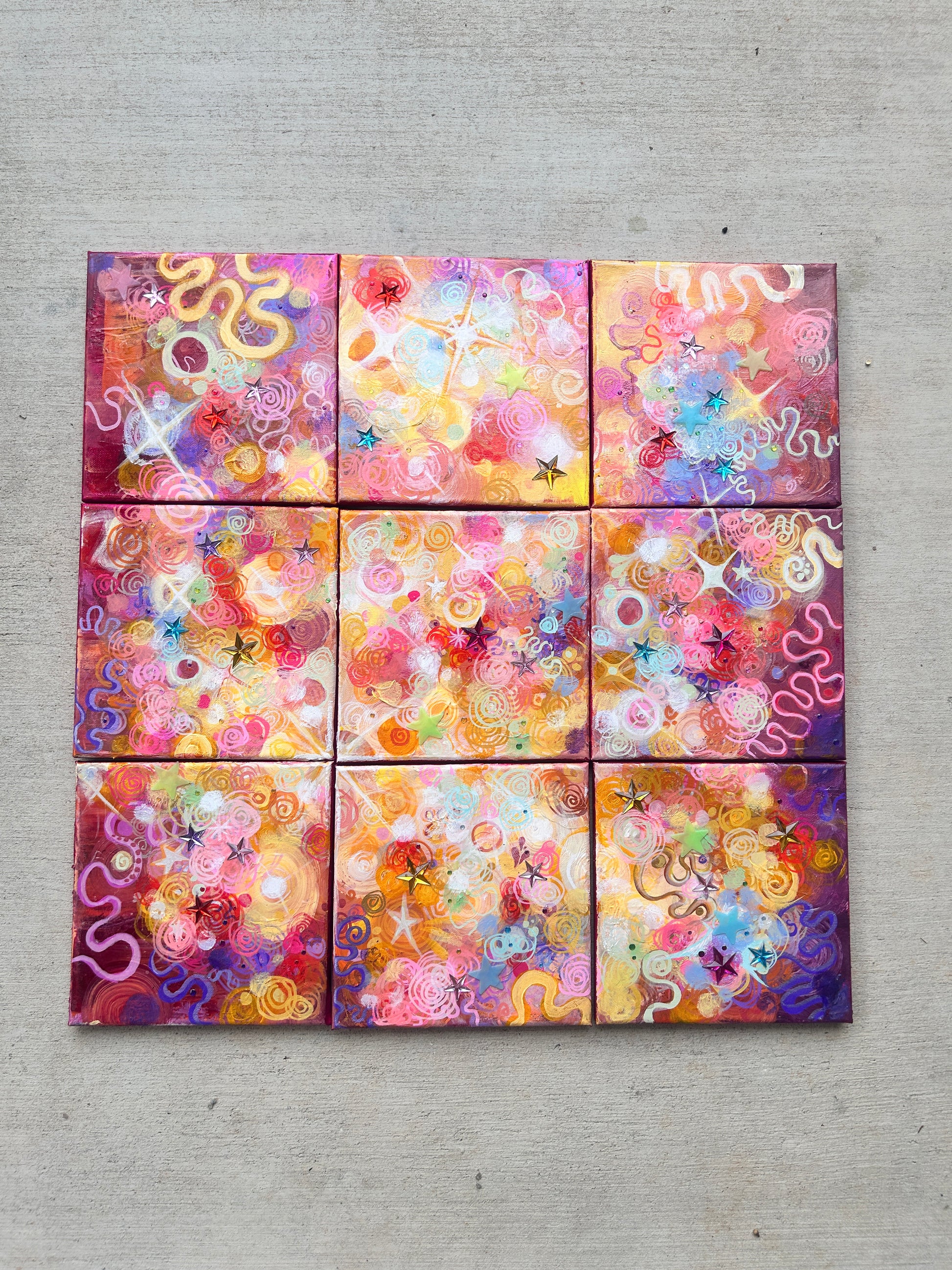 - Medium: acrylic and mixed media on stretched canvas